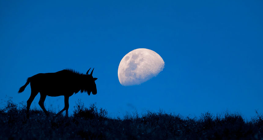 GUIDING LIGHT Moonlight affects animals in many different ways. For wildebeests (one shown), which are vulnerable to nocturnal attacks by lions, moonlight can be an indicator of how dangerous the coming evening will be.
