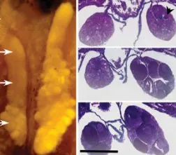 DAD’S EGGS. Ordinarily, a frog testis pinches during development, and the lower two-thirds disappears. However, atrazine-exposed males can retain this lower portion, which can produce eggs (bumps in the left photo).