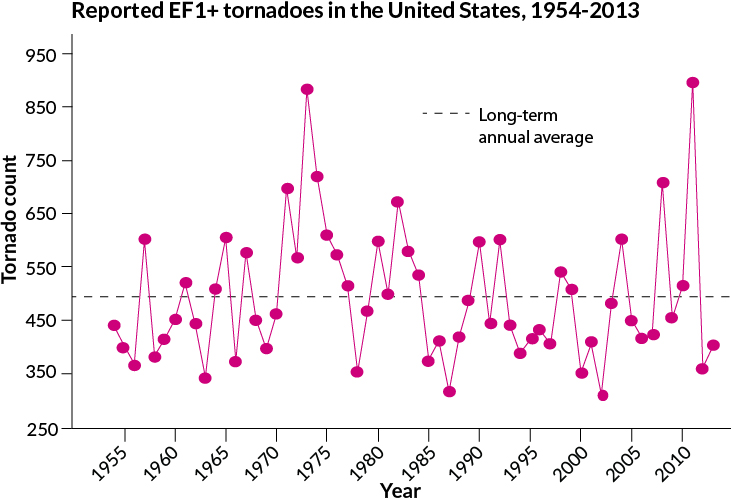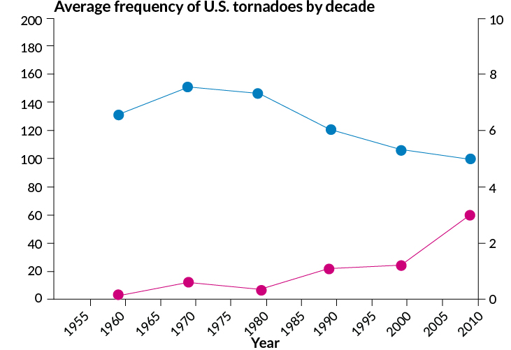 TWISTED The number of days per year with tornadoes has gone down over the last few decades in the U.S., but the number of days that see 30 or more twisters is going up.