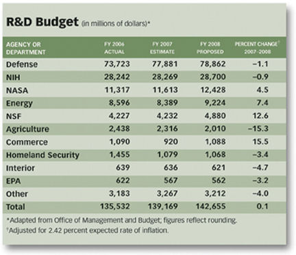 This year’s proposed budget brought disappointments to some agencies. For example, the proposed budget provides the Environmental Protection Agency (EPA) with its fourth consecutive year of reductions. EPA’s allotment of $562 million for R&D is down $5 million from the 2007 estimate, a decrease of about 3.2 percent with the expected rate of inflation.