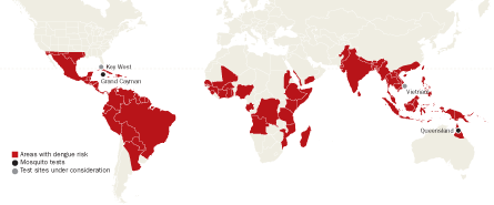 Though not as famous as malaria outside the tropics, dengue makes a worthy target. It’s the forgotten pandemic, says Scott Ritchie, a medical entomologist at the James Cook University in Cairns, Australia, who works with O’Neill. A potentially lethal viral disease, dengue has been spreading rapidly since the 1970s. Now more than 40 percent of the world’s population lives at risk. A first round of the disease brings such miseries as a fever of around 104° Fahrenheit (40° Celsius), a sharp headache behind the eyes and intense skeletal pain, inspiring the name “breakbone fever.”