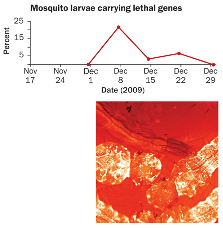 Even though he came to the concept late, his years of research on fruit fly genetics gave him an unusual take on irradiating mosquitoes. Why bother, he wondered. Considering what geneticists can do as a matter of routine, it might be possible to sterilize male mosquitoes genetically. Alphey says his inspiration was “an idea at the right time.”