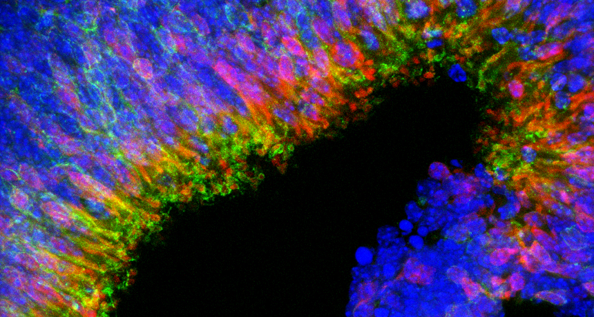 EYE CANDY Researchers grew primitive retinas (one shown, with proteins that collect and transmit light signals in green and red) by embedding mouse embryonic stem cells in a gel. Immature cells from the lab-grown structures can integrate into adult eyes.