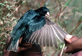 BIRDS OF A FEATHER. The indigobird Vidua raricola now flashes a different underwing feather color from that of its near relatives, but song preference may have divided the species.