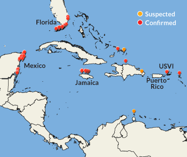Stony coral tissue loss disease appeared off Florida in 2014 and has since spread across the Caribbean. Cases of the disease have been confirmed (red) on reefs off Mexico, Jamaica, St. Maarten, the Dominican Republic and St. Thomas in the U.S. Virgin Islands. Suspected cases are shown in orange.
