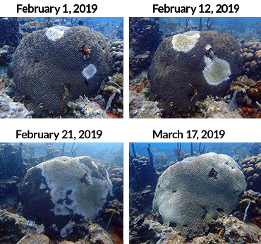 Stony coral tissue loss disease can kill corals in a matter of days or weeks. Here, a lesion eats away at coral tissue over six weeks.