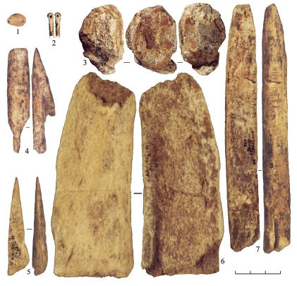 Remains include bone points and narrow, sharpened stone implements, which might have been used to carve bone. The team also found a piece of carved ivory that might represent a person’s head, and shells with holes punched in them. Much of the stone used for tools came from areas about 100 miles from Kostenki, the scientists hold. They say that shells at Kostenki were probably imported from the Black Sea, more than 300 miles away.