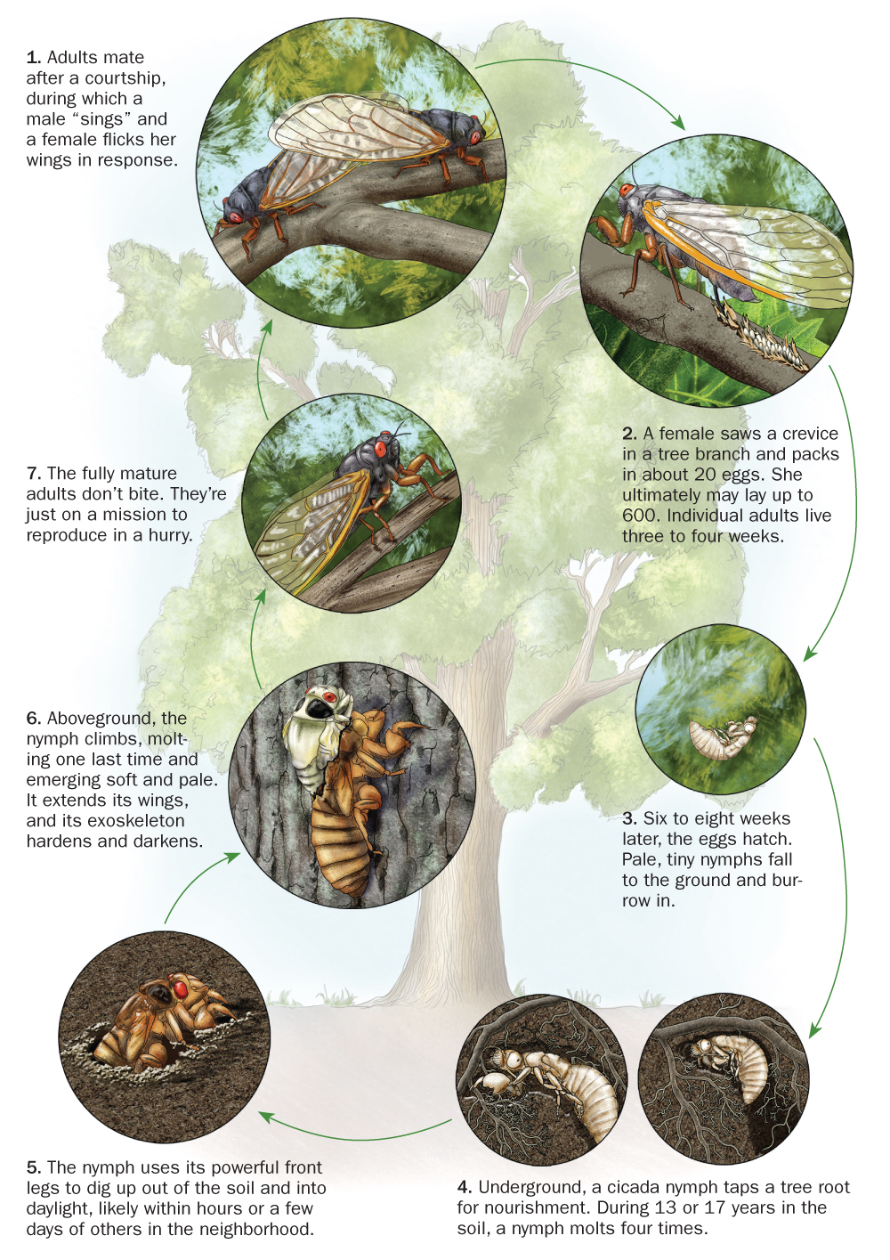 Billions of noisy bugs may attract all the attention, but the cicadas’ mass emergence is just the final blip in the long life of the periodical species. All seven species spend the majority of their lives buried in the soil. Then, on cue, they surface to find a mate and reproduce.