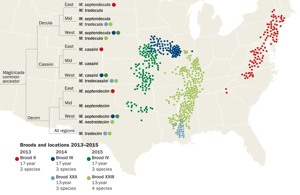 Source: T. Sota et al/PNAS 2013 and Magicicada.org; Map: E. Otwell