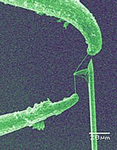 Using an electron microscope, he and his colleagues steered a micromechanical probe capable of 5-nanometer motions to pluck a single nanotube from a mass of twisted strands. Then, the researchers fired the beam of the electron microscope to spot weld the tube between the tips of two tungsten needles.