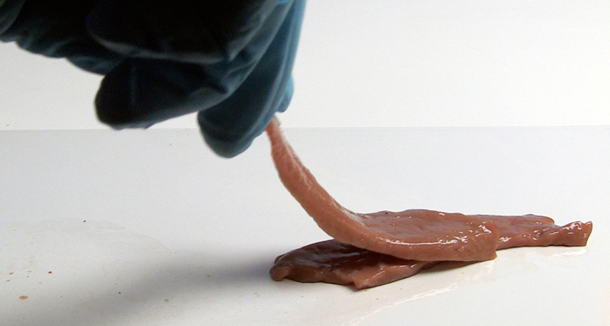 STUCK TOGETHER Pieces of calf liver adhere to each other when glued together with silica nanoparticles.