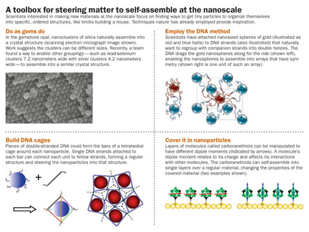 It would be far cheaper and easier, researchers agree, if nanoparticles could just arrange themselves into nanomaterials —like dropping the pieces of the ship into the bottle and then sitting back to watch the ship build itself. What scientists are working on now is finding the right chemistry — creating just the right conditions so that natural properties such as charge or magnetism direct the pieces of the ship to come together just so, with the mast above the deck and never below or to the side.