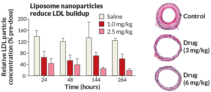 Various plaque-targeting nanoparticles have been shown to be effective at lowering the levels of LDL in the blood of nonhuman primates (left, graph) and at keeping rabbits’ blood vessels open after a stent is inserted (right). The approach used in rabbits is now in early patient testing.