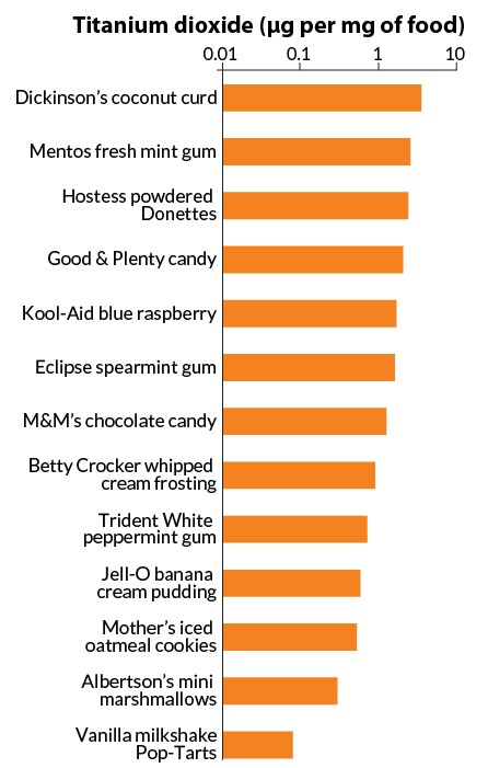 Titanium dioxide is also a food additive approved by the U.S. Food and Drug Administration. Ground to teensy particles measuring just tens of billionths of a meter in size — much smaller than a cell or most viruses — titanium dioxide nanoparticles are frequently added to foods to whiten or brighten color.