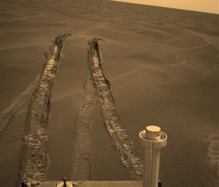 “The rover’s at a 20-something degree tilt, inside this bowl with rover death trap sand dunes below, driving on a surface that’s like plywood with ball bearings on it,” says planetary scientist Jim Bell of Arizona State University in Tempe, who oversaw the science using the rover’s cameras. “And the engineers are like ‘Yeah, let’s do it! Let’s drive down!’ That was gutsy.” The drive tested the limits of what the rover could do, says Bell.