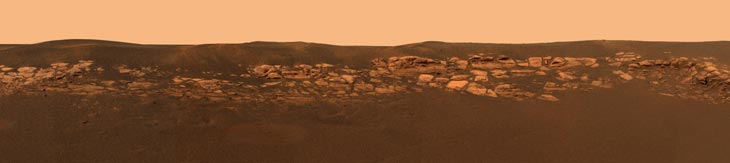 Snapped January 28, the image shows exposed layered bedrock, which the team determined was probably sediments laid down by water. The rocks in Opportunity’s landing site had probably been formed in a long-lived salty sea (SN: 3/27/04, p. 195).
