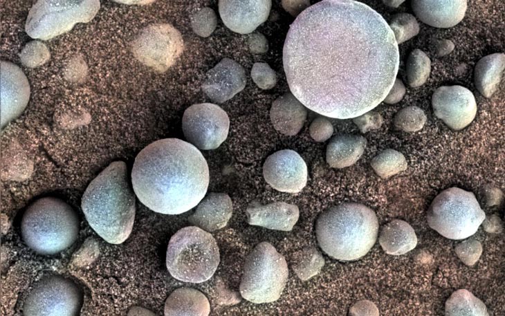 The area around Opportunity’s landing site held another watery secret in the form of these small hematite spheres. They’re so tiny that dozens can crowd into a spot just 3 centimeters across.