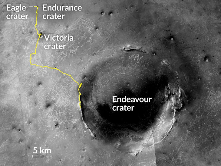 Eagle crater was just the first crater Opportunity explored. During the rover’s first six years, it made daredevil drives around and into bigger and bigger craters. For instance, in a risky move just months after its Mars arrival, the rover drove inside the edge of stadium-sized Endurance crater.
