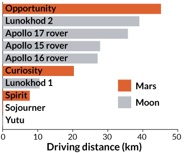 Going the distance taught the team a lot about how to drive on Mars. “We know the maximum climbable slope, or the kind of slip you can expect for various tilts and ground types,” Nelson says. Opportunity’s self-guided navigation system was incorporated into the Curiosity rover and will be used for the upcoming Mars 2020 rover as well (SN: 12/22/18, p. 5).