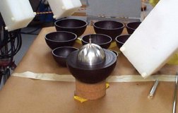 NUCLEAR NEST. To rev up nuclear chain reactions, researchers tucked an aluminum-covered neptunium ball inside dark uranium shells.