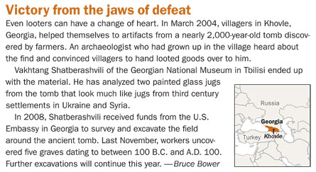 Even looters can have a change of heart. In March 2004, villagers in Khovle, Georgia, helped themselves to artifacts from a nearly 2,000-year-old tomb discovered by farmers. An archaeologist who had grown up in the village heard about the find and convinced villagers to hand looted goods over to him.
