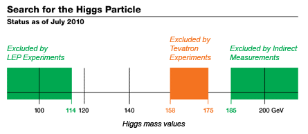 Studies from the Large Electron-Positron Collider, which shut down in 2000 at the European research organization CERN, along with indirect constraints from both theory and experiments, had indicated that the Higgs could have a mass anywhere between 114 and 185 GeV. In late 2009, the two Tevatron experiments, known as CDF and DZero, excluded the range between 162 GeV and 166 GeV. With the new constraints, CDF and DZero have now ruled out nearly 25 percent of the mass range for the Higgs allowed prior to 2009, before the two experiments began weighing in on the proposed particle.