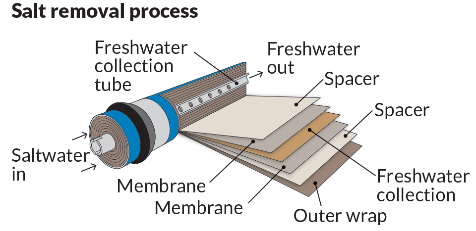 The membranes are rolled like rugs and stuffed into meter-long tubes with additional layers that direct water flow and provide structural support. A large desalination plant uses tens of thousands of membranes that fill a warehouse. This process is known as reverse osmosis and the result is salt-free water plus a salty brine waste product that is typically pumped underground or diluted with seawater and released back into the ocean. It takes about 2.5 liters of seawater to make 1 liter of freshwater.