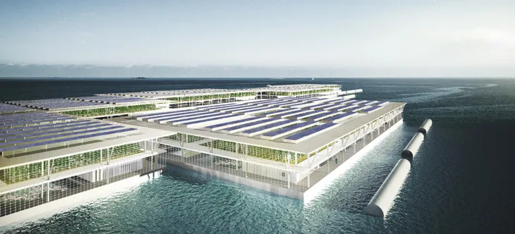 Floating farms would lay anchor along coastlines and suck up seawater, he proposes. A solar panel–powered water desalination system would provide freshwater to rows of cucumbers, tomatoes or strawberries stacked like a big city high-rise inside a “blue house” (that is, a floating greenhouse).