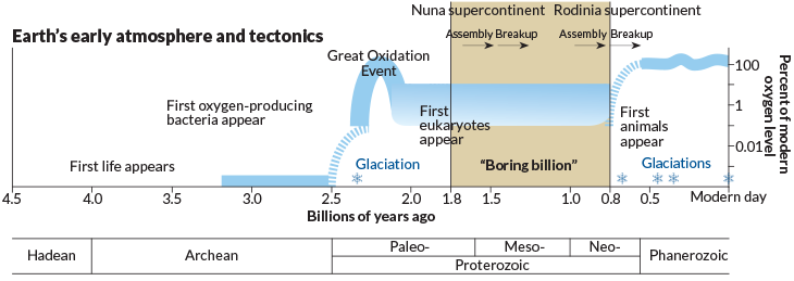 Life and oxygen on Earth have remained tightly entangled for billions of years. Following a rise known as the Great Oxidation Event, oxygen levels (blue) seemingly steadied for roughly a billion years, though precise data about much of the interval are lacking. During this time span, Earth remained warm with no glaciations (marked by snowflakes), despite supercontinent formation and breakup.