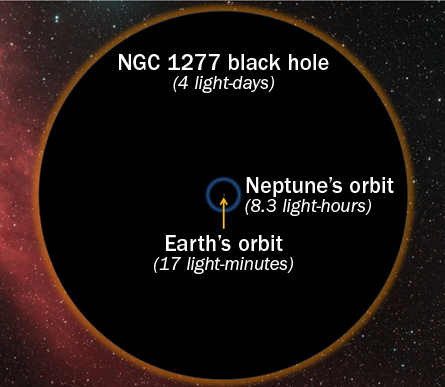 Bonning and Shields suggest that the black hole spent a few billion years whizzing through intergalactic space at about 4.5 million kilometers per hour. It had some companions for its journey: a posse of millions of orbiting stars trapped by the black hole’s intense gravitational pull. Finally the black hole made a close pass to NGC 1277, and over hundreds of millions of years, the galaxy reeled it in to its center.