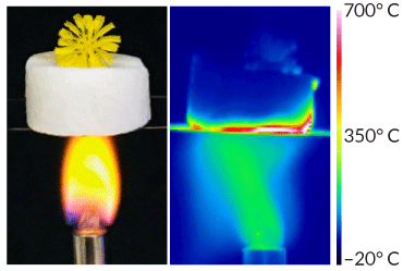 Whereas other ceramic aerogels are liable to break down under sudden temperature shifts or extended heat exposure, the new aerogel withstood 500 cycles of rapid heating and cooling from –198° C to 900° C, as well as sitting at a scalding 1400° C for one week. A piece of the insulator also successfully shielded a flower held over a roughly 500° C flame.