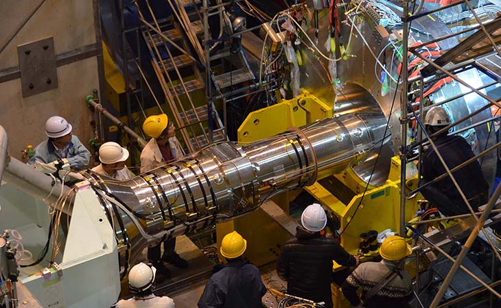 NARROW FOCUS Scientists insert superconducting magnets into the center of Belle II. The magnets focus the beams of electrons and positrons that collide inside the detector. KEK IPNS