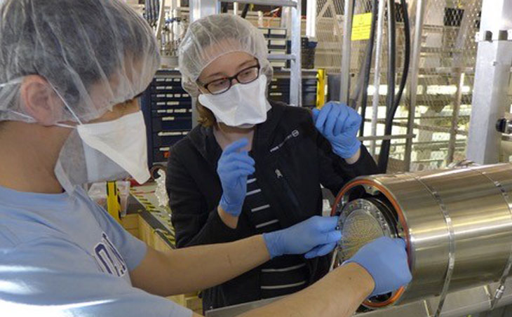 ELECTRON CATCHER Physicists Larisa Thorne of Carnegie Mellon University and Florian Fränkle of the Karlsruhe Institute of Technology work on KATRIN’s detector system, which spots electrons produced in tritium decays. Florian Fränkle