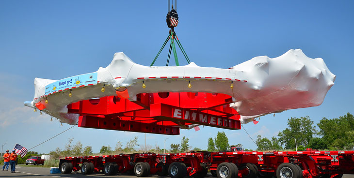 MOVING DAY A crane lifts the 50-ton apparatus containing Muon g-2’s magnetic ring, at the start of a cross-country journey to move the ring from Brookhaven National Laboratory in New York to Fermilab in Illinois. Brookhaven National Laboratory
