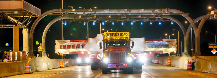 PERFECT FIT The Muon g-2 experiment’s 50-foot electromagnetic ring had to be transported across Illinois in the middle of the night. It barely squeaked through an electronic tolling arch, shown here. Reidar Hahn/Fermilab