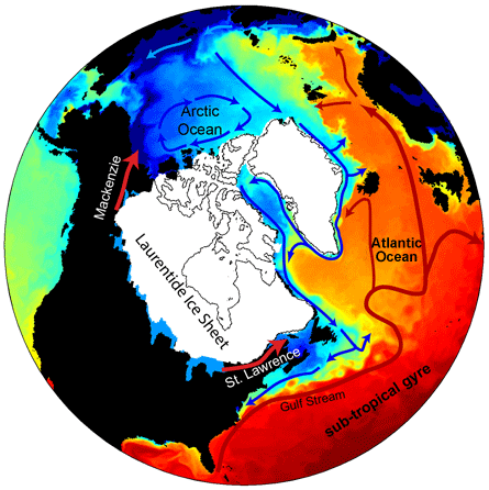 New computer simulations indicate ocean currents would have transported the Arctic floodwaters to the North Atlantic near Greenland, where the freshwater would have disrupted the ocean’s circulation of heat. Freshwater flowing into the Atlantic through Canada’s Gulf of St. Lawrence — the previously hypothesized source of the flood — would have been carried too far south to disturb heat flow, researchers report online November 5 in Proceedings of the National Academy of Sciences.