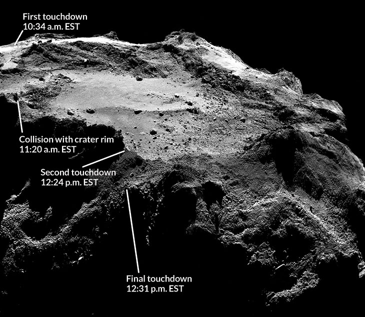 Editor’s Note: This story was updated August 4, 2015, to clarify that Philae touched down in three spots, not two, and to correct a photo credit.