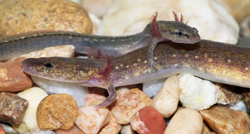 FOREVER YOUNG The newly described salamander species Eurycea subfluvicola (bottom) keeps some of the physical characteristics of young salamanders even as an adult. Its youthful looks make it hard to distinguish from juveniles of a related salamander species, E. multiplicata (top).