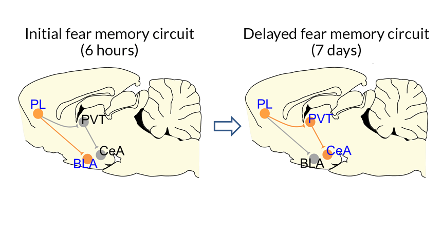 SHIFTING CIRCUITS In rats, a fear memory is initially recalled through brain cell connections between the prefrontal cortex (PL) and the basolateral amygdala (BLA). A week later, the circuit to recall the same memory shifts, relying on neurons in the paraventricular nucleus of the thalamus (PVT) that connect to the central amygdala (CeA).
