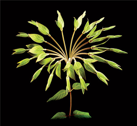 And De Moraes’ work shows that even a rumor of war can create a state of preparedness in a naive leaf. The way poplars’ internal plumbing system is structured means that a leaf does not have a direct connection to its immediate neighbor. When De Moraes experimentally “attacks” leaf number one, volatiles waft to near neighbors, and those volatiles can constitute gossip about the nature of the attacker. Should she challenge those neighbors later with their own crisis, they rev up their defense genes faster than does a leaf prevented from receiving the informative volatiles. Biochemical gossip has its value.