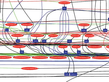In a diagram of a gene and protein network, each dot represents a certain gene or protein, and a line between dots means that those two parts interact in some way. Perhaps one gene activates another, or a protein binds to and inhibits another protein. A basic network diagram looks a bit like a game of connect the dots that ends in a jumbled mess instead of a pretty picture.