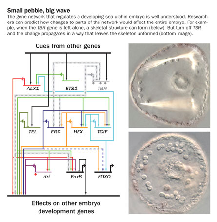 Perhaps the best-understood large gene network is the one controlling the development of sea urchin embryos. Over the past four decades, Eric Davidson, a cell biologist at California Institute of Technology in Pasadena, has been studying sea urchin development. In the past few years he’s assembled a detailed model of the gene networks that orchestrate the entire process of intestine formation. In the April 22 Proceedings of the National Academy of Sciences, Davidson and his colleagues also published a detailed description of the networks that steer some of the urchin’s cells into becoming skeleton-forming cells.