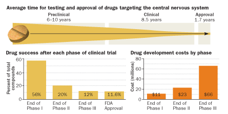 A survey of pharmaceutical and biotechnology companies revealed the perils of investing in drugs that target the brain. These drugs are more likely to fail and leak out of the pipeline than other kinds of medications. And brain-targeting drugs spend an average of 8.5 years in human tests alone, more than two years longer than the average for other kinds of drugs. “These tend to be very difficult, expensive clinical trials,” Kaitin says. Companies that endure a late-stage failure of a drug after years of testing take a huge financial hit. “Very few companies can withstand that,” he says.