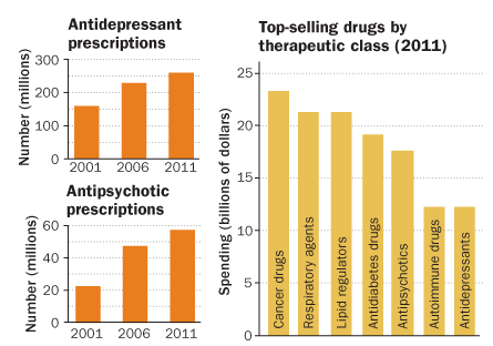 Many current drugs do exist — by one count, more than 50 different psychiatric medicines together garnered $25 billion in sales in the United States in 2011. But these treatments often don’t deliver. “There may be a lot of medicines out there, but they’re not doing what we need them to do,” says Thomas Insel, director of the National Institute of Mental Health.