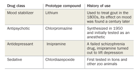 Most psychiatric drugs in use today originated in serendipitous discoveries made many decades ago. In 1952, doctors noted that patients on the antituberculosis drug iproniazid became euphoric. The observation launched iproniazid, the first antidepressant. A version of the schizophrenia drug chlorpromazine was originally tested in the 1950s as an anesthetic. Around that time, a French surgeon recognized the drug’s potential in psychiatry, noting that before surgery patients on the drug became “calm, somewhat somnolent, and relaxed.”