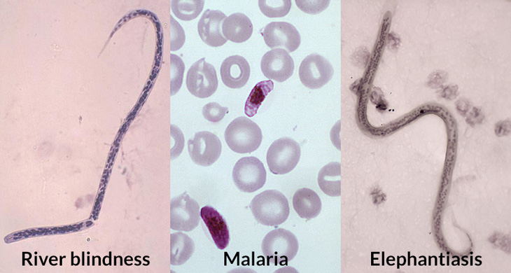 Credits: (L-R)Dr. Lee Moore/CDC (Onchocerca volvulus); Dr. Mae Melvin/CDC (Plasmodium falciparum); Marc Perkins/Flickr (CC BY-NC 2.0) (Wuchereria bancrofti).