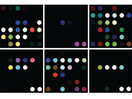 The nose is a high-tech litmus test, says Kenneth Suslick of the University of Illinois at Urbana-Champaign, who led the new work. A postage-stamp–sized array of 36 dyes, selected from hundreds for their reactivity, is printed on glass, paper or plastic. Some of the dyes react strongly to electron-donating molecules, for example. Exposure to a particular gas yields a specific pattern of colored dots, providing a chemical fingerprint. This fingerprint is then matched to a database, exposing the culprit chemical.