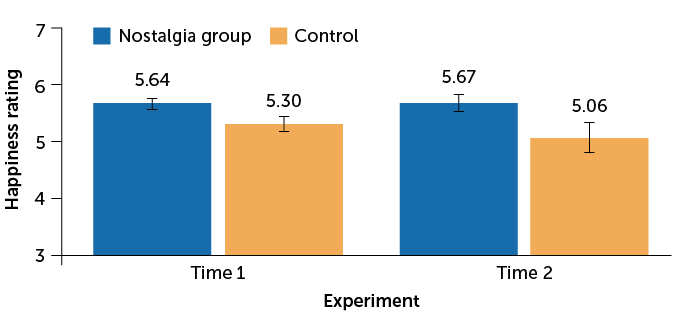 Early in the pandemic, researchers tested the impact of nostalgia on happiness. Volunteers were asked to call up a special memory and spend three minutes writing about it. When asked to rate their happiness on a scale of 1 to 7, this group scored slightly higher than volunteers in the control group who were asked to think about an ordinary memory (Time 1). A day or two after the original experiment, researchers asked participants in the nostalgia group to think about their memory again. That “nostalgia booster” once again prompted higher happiness scores (Time 2).
