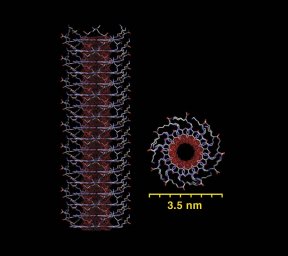 The result, reported in the April 25 Journal of the American Chemical Society, was 3.5-nanometer-wide tubes with rosette cross-sections. Since the starting molecules bond only with identical molecules that fit into the rings, the nanotubes have uniform widths and few defects, says Fenniri.