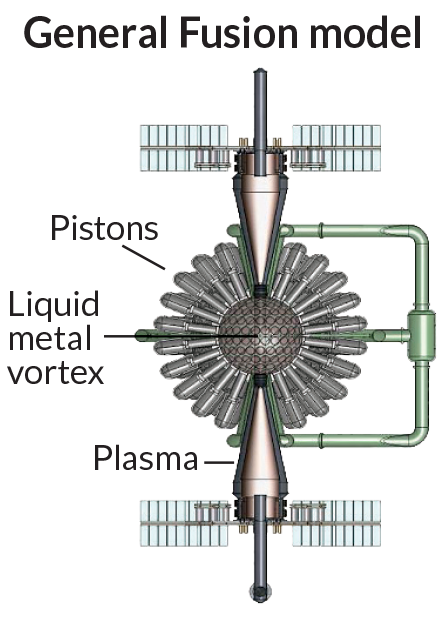 RENEGADE FUSION Private-sector startups, like General Fusion, are betting they can develop an energy source for the future faster than government-funded projects. General Fusion's prototype (shown) uses pistons that converge on magnetized, superhot plasma.